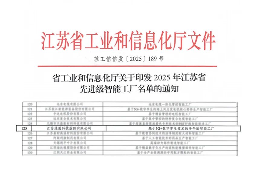 近日,江蘇省工業(yè)和信息化廳正式公布2025年江蘇省先進級智能工廠名單,通用股份榮耀上榜。這一榮譽不僅是對通用股份前瞻創(chuàng)新實踐的高度認(rèn)可