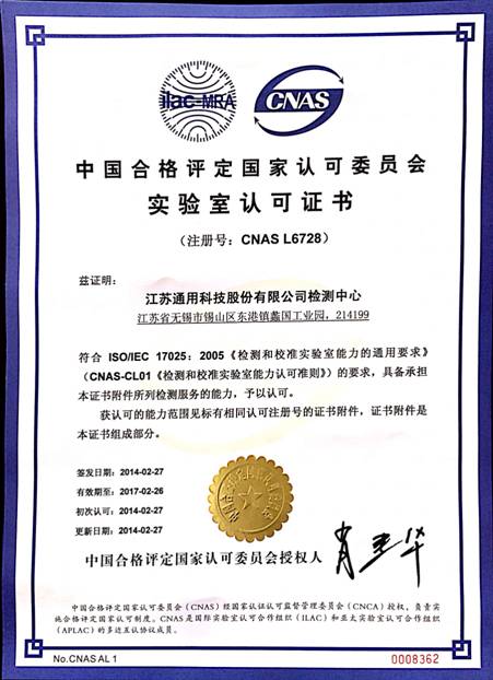 2014年2月27日,中國(guó)合格評(píng)定國(guó)家認(rèn)可委員會(huì)(CNAS)正式授予江蘇通用科技股份有限公司檢測(cè)中心國(guó)家實(shí)驗(yàn)室認(rèn)可資質(zhì),認(rèn)可證書(shū)編號(hào):L6728。